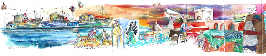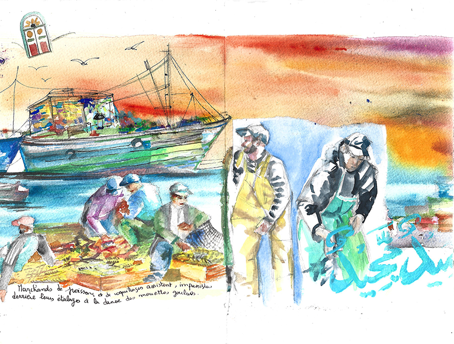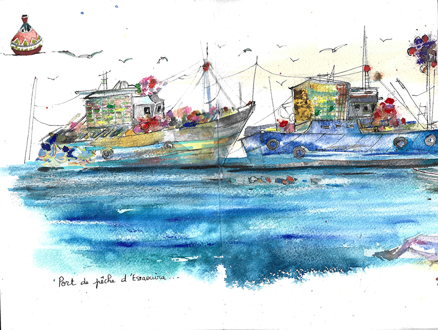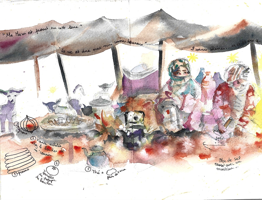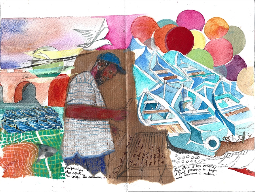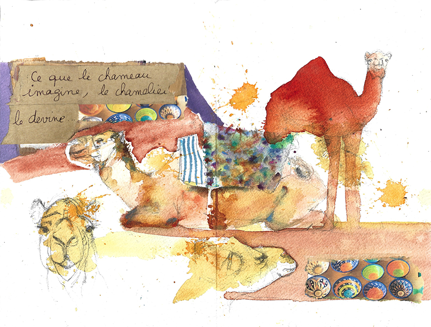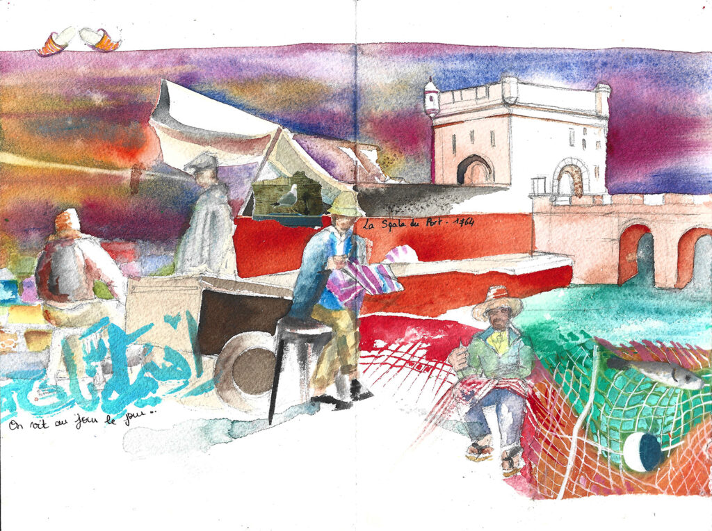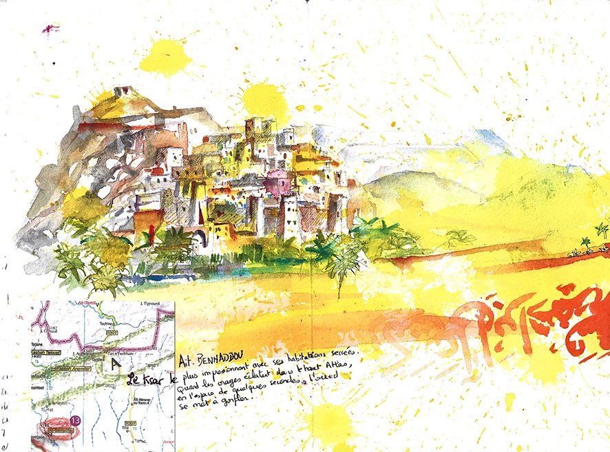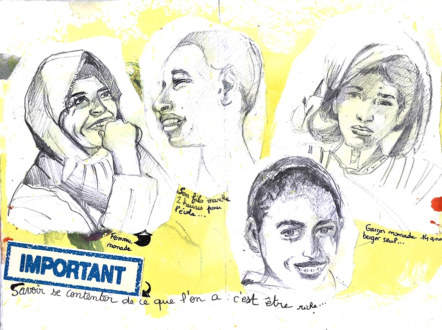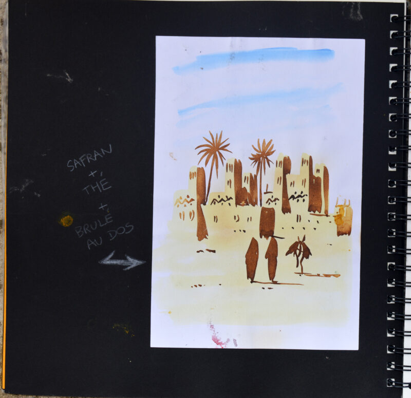 Face aux croquis que j’avais fait sur place, il m’est arrivé de ressentir à nouveau la chaleur du soleil, l’odeur de la tagine. Il vaut mieux préparer un carnet avec du matériel aquarelle de voyage avant de partir pour pouvoir le rassembler ou le relier au retour. Avec une unité de format vous pourrez intégrer d’autres croquis. Votre carnet dessin aquarelle peut très bien comporter des papiers de plusieurs couleurs (beiges, gris noirs). Pour ma part, je réserve des feuilles blanches sur lesquelles je pourrai coller des photos, des cartes ou des croquis faits sur un papier plus léger. J’ai découvert le plaisir dépeindre en voyageant lors de mon premier voyage dans le haut atlas avec Christine Peseux. Une immersion totale dans le pays à travers l’art. Le lien intime et particulier que l’on a avec notre carnet qui devient le confident de tous nos moments vécus. Des notes, des histoires, des parenthèses sur un moment partagé en peinture aquarelle. J’ai aimé cette expérience au plus profond de l’intime, ce lien avec les habitants par le biais de la peinture qui nous apporte des échanges nouveaux. Cette confiance accordées plus facilement que si je photographiais. Ces hommes, ces femmes, ces enfants qui se prêtent au jeu de la caricature les rend curieux. Ces carnets de voyage aquarelles qui nous rendent dépendants de chaque annotation, chaque péripétie. Sur un coin de table, un genou, allongé dans le lit… Une envie de raconter, de laisser une trace instantanée.