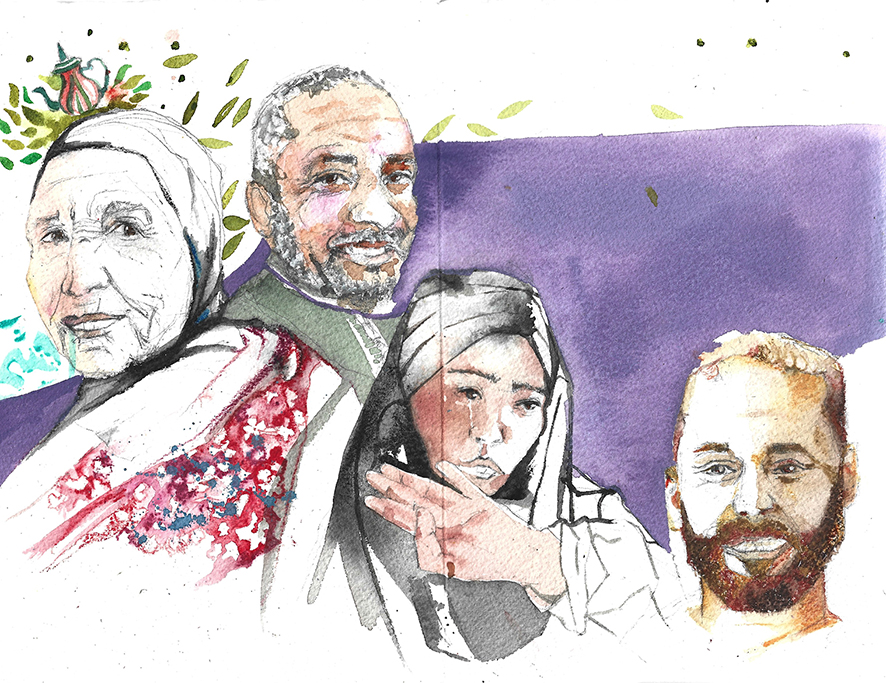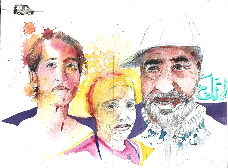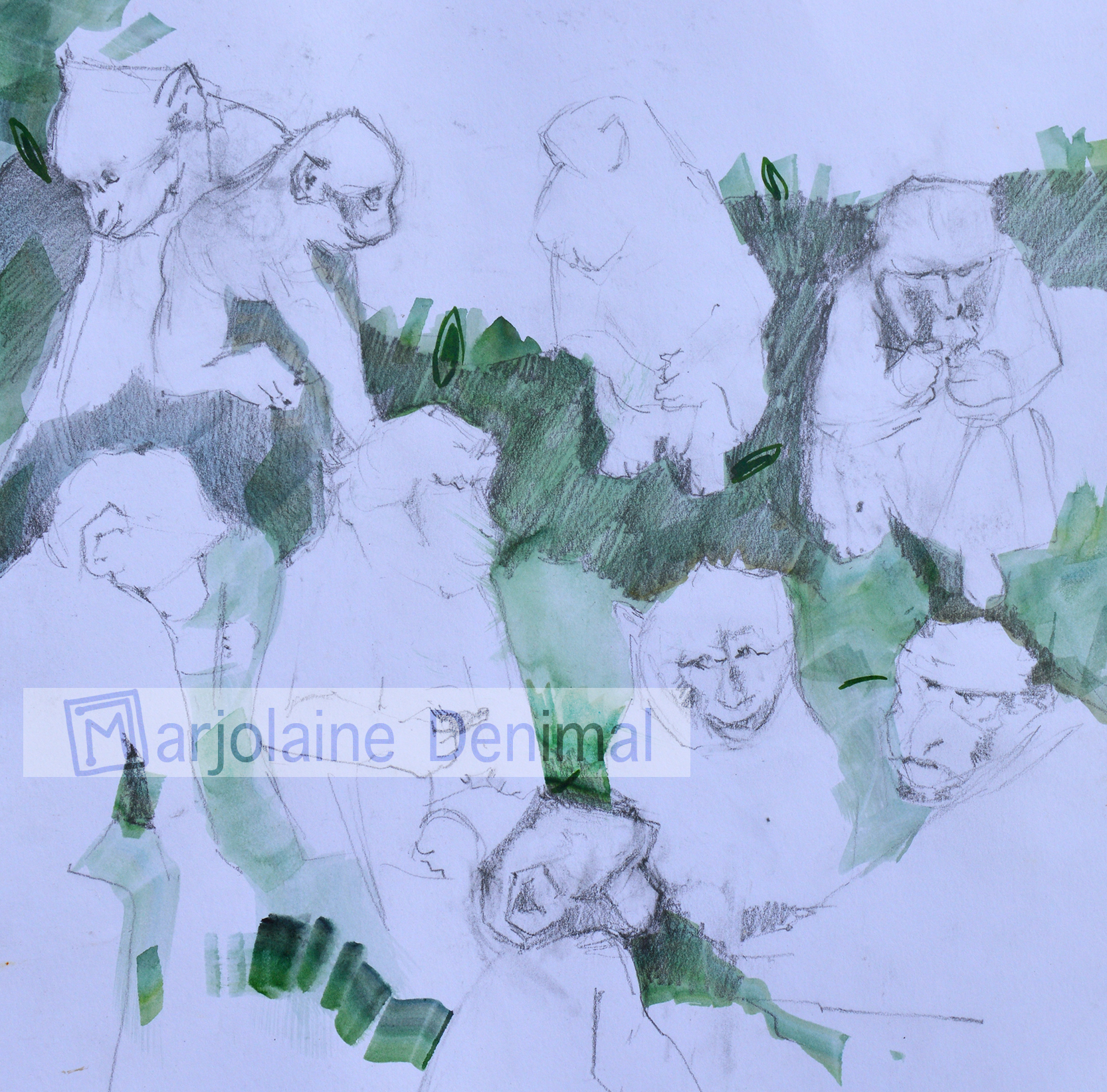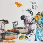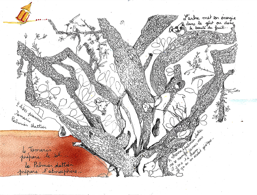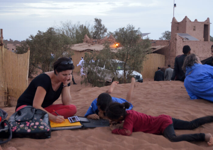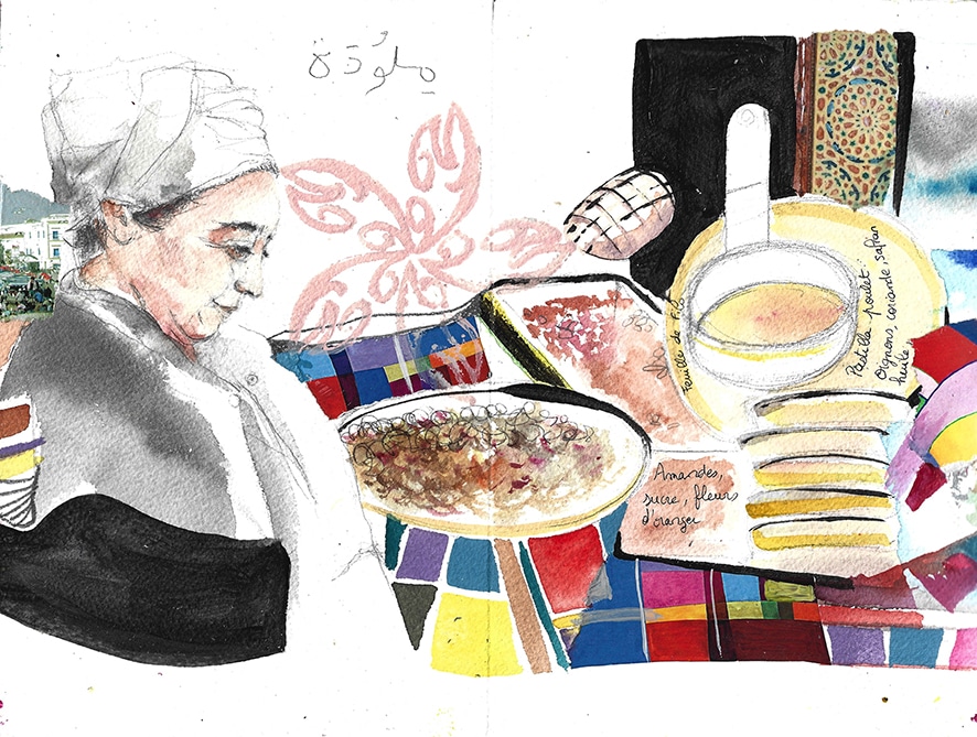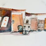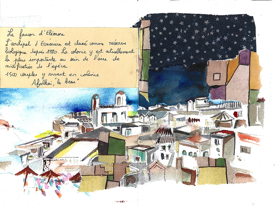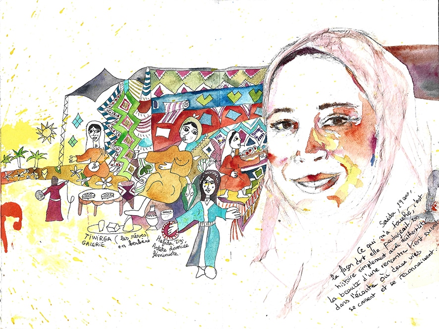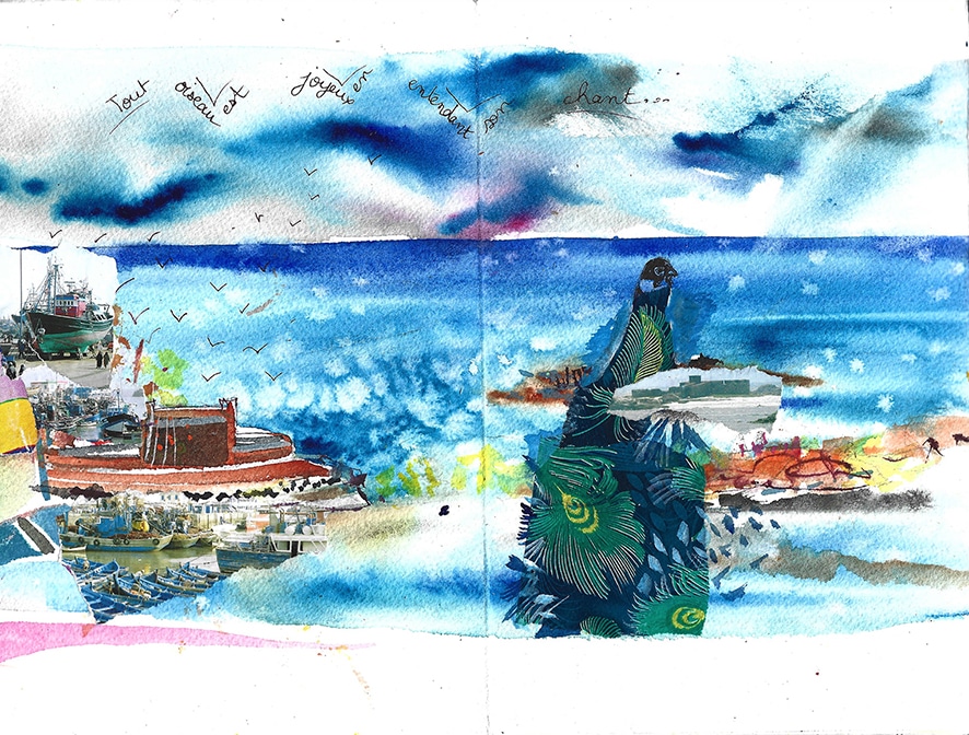 Face aux croquis que j’avais fait sur place, il m’est arrivé de ressentir à nouveau la chaleur du soleil, l’odeur de la tagine. Il vaut mieux préparer un carnet avec du matériel aquarelle de voyage avant de partir pour pouvoir le rassembler ou le relier au retour. Avec une unité de format vous pourrez intégrer d’autres croquis. Votre carnet dessin aquarelle peut très bien comporter des papiers de plusieurs couleurs (beiges, gris noirs). Pour ma part, je réserve des feuilles blanches sur lesquelles je pourrai coller des photos, des cartes ou des croquis faits sur un papier plus léger. J’ai découvert le plaisir dépeindre en voyageant lors de mon premier voyage dans le haut atlas avec Christine Peseux. Une immersion totale dans le pays à travers l’art. Le lien intime et particulier que l’on a avec notre carnet qui devient le confident de tous nos moments vécus. Des notes, des histoires, des parenthèses sur un moment partagé en peinture aquarelle. J’ai aimé cette expérience au plus profond de l’intime, ce lien avec les habitants par le biais de la peinture qui nous apporte des échanges nouveaux. Cette confiance accordées plus facilement que si je photographiais. Ces hommes, ces femmes, ces enfants qui se prêtent au jeu de la caricature les rend curieux. Ces carnets de voyage aquarelles qui nous rendent dépendants de chaque annotation, chaque péripétie. Sur un coin de table, un genou, allongé dans le lit… Une envie de raconter, de laisser une trace instantanée.