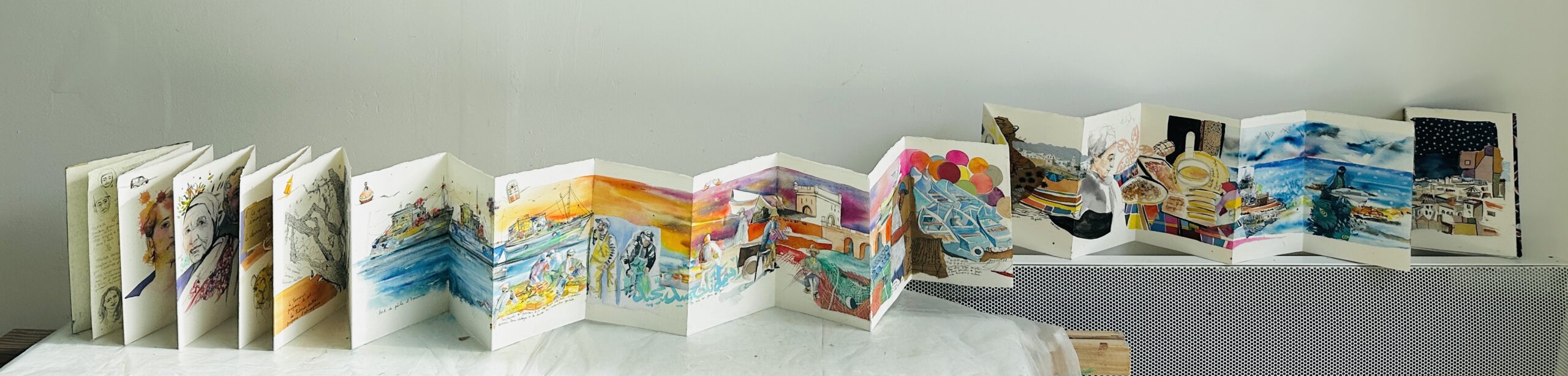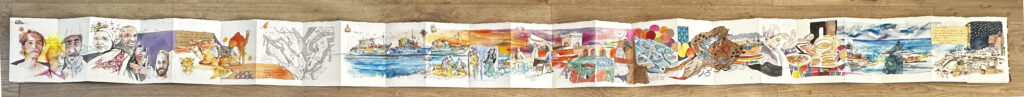 J’ai choisi de réaliser mon carnet de voyage sous forme de leporello : un livre accordéon dont les pages se déploient en une seule bande. Ce format permet une lecture fluide et poétique, comme une promenade à travers mes aquarelles et mes souvenirs.