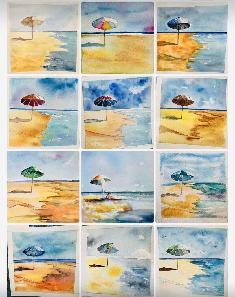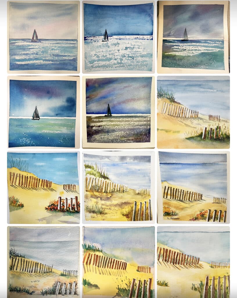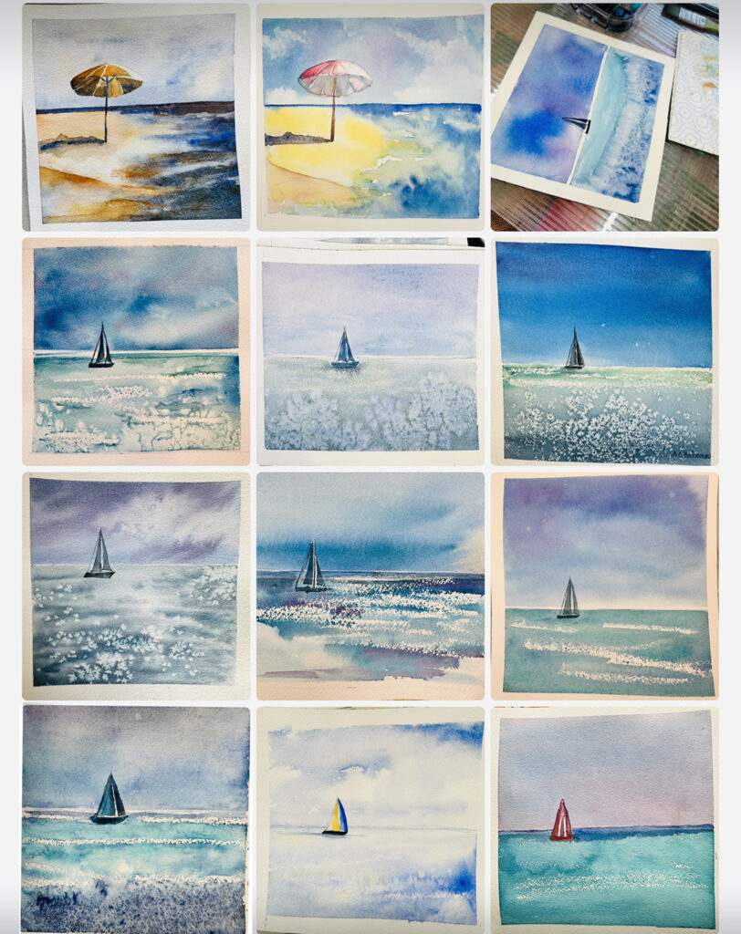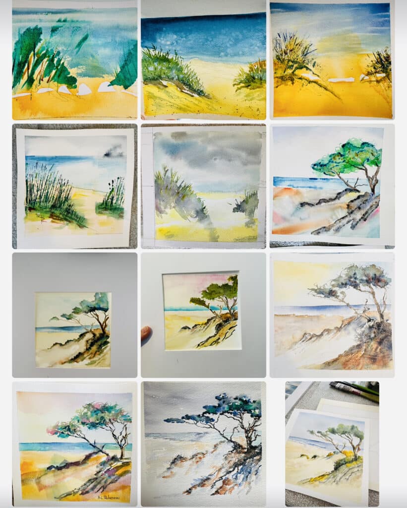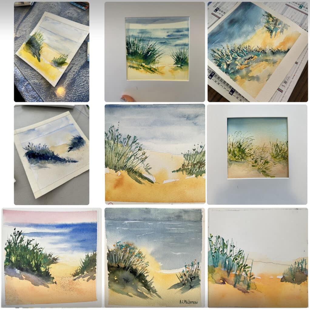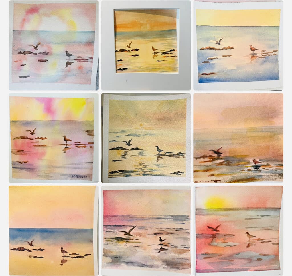 En ce début d’année, ces exercices ont pour objectif de retrouver les gestes fondamentaux de l’aquarelle et d’explorer à nouveau ses techniques essentielles.
