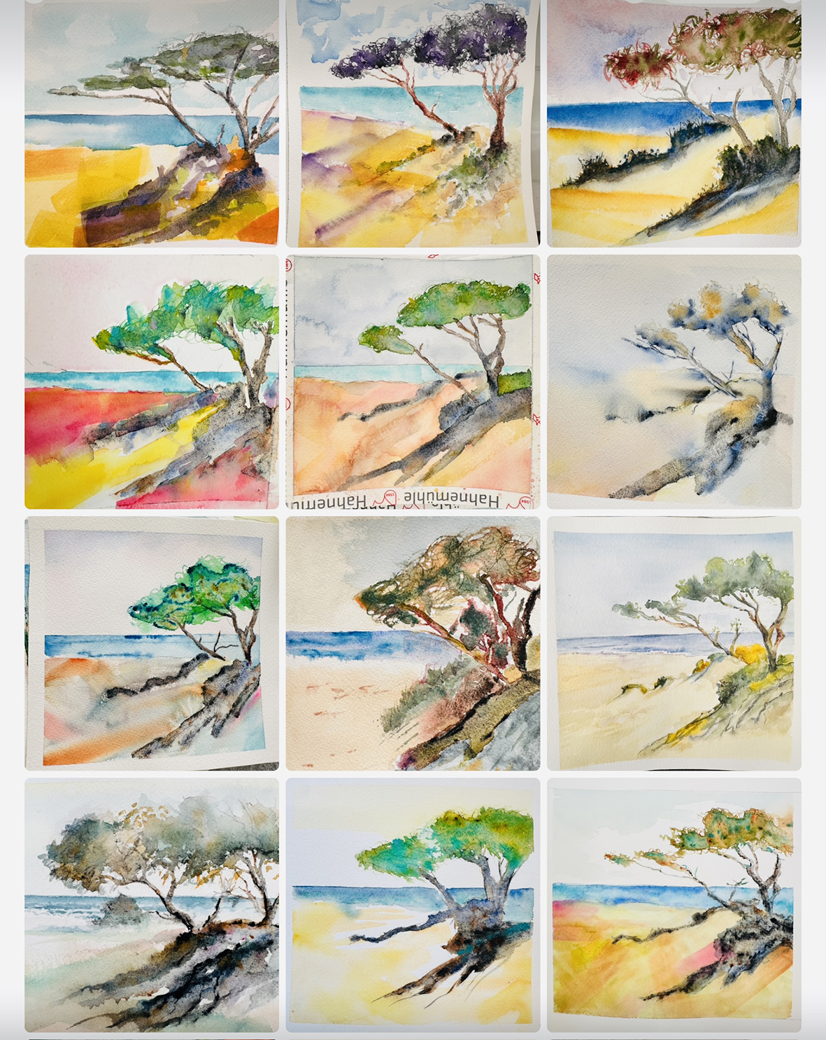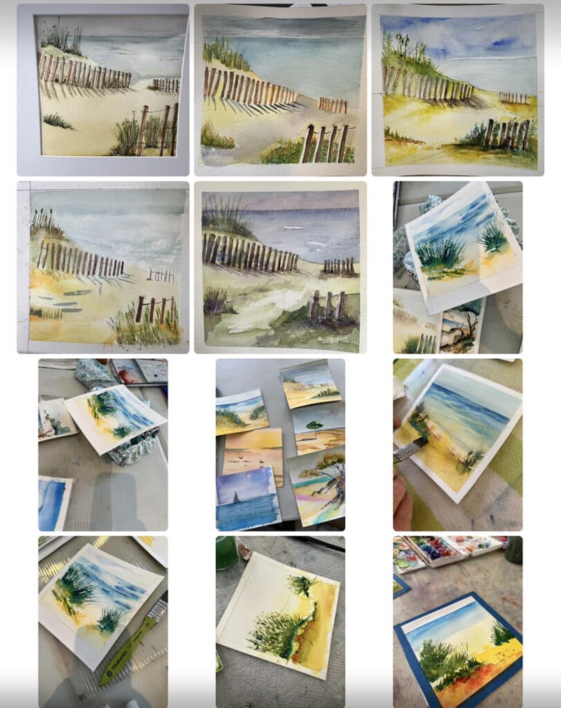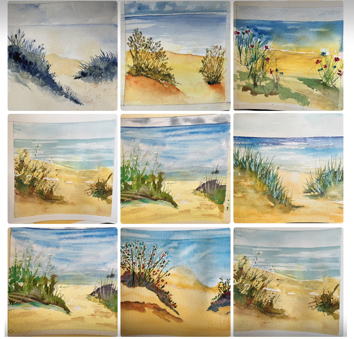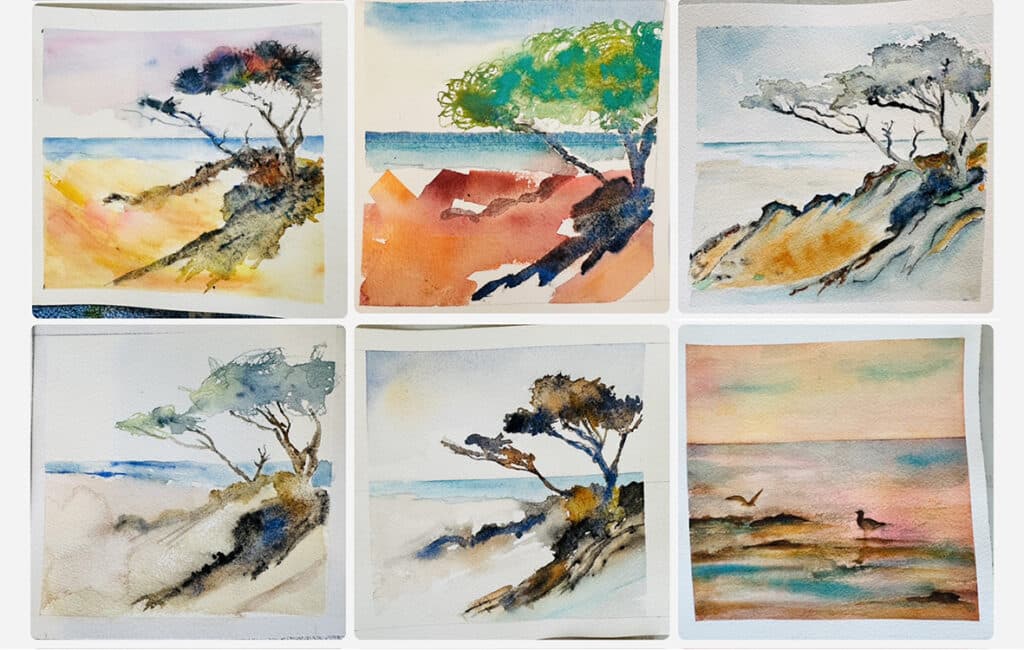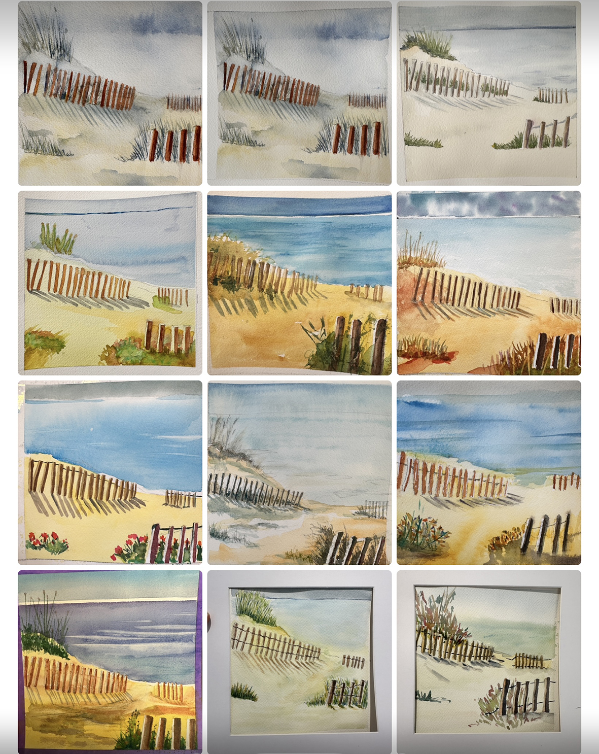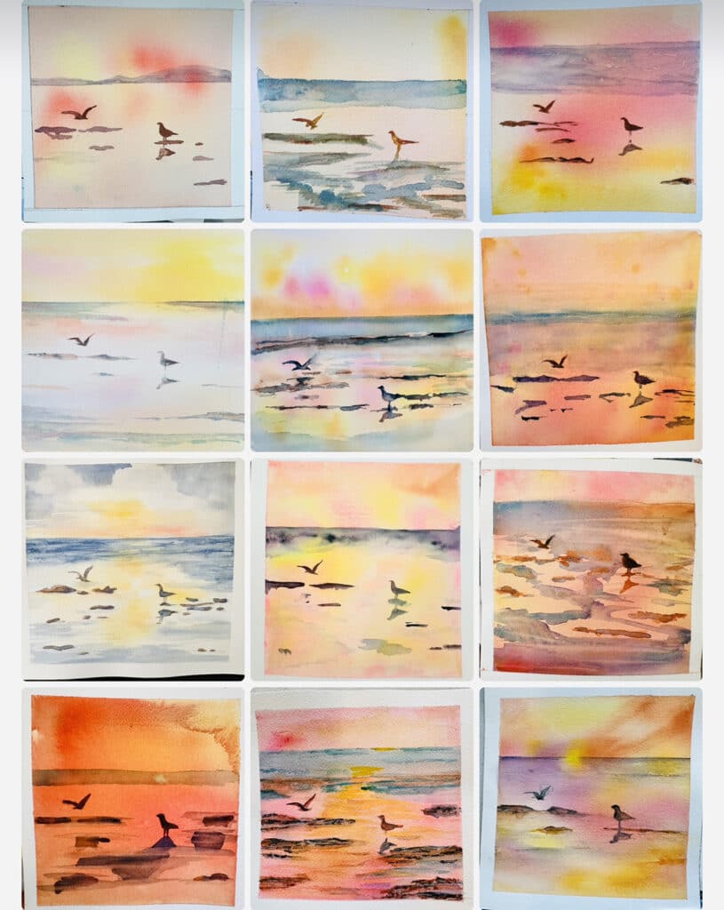 En ce début d’année, ces exercices ont pour objectif de retrouver les gestes fondamentaux de l’aquarelle et d’explorer à nouveau ses techniques essentielles.